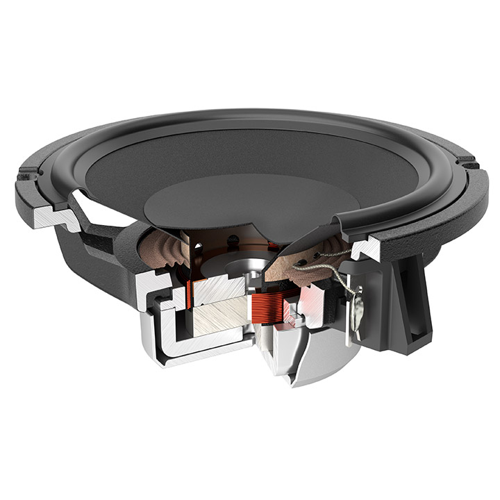 Le milieu de gamme AV 3.0 II est doté d'une toute nouvelle configuration de moteur qui permet d'obtenir un rendement proche de celui d'un moteur classique. 20% diminution de la profondeur de montage - sans réduction de la tenue en puissance, de l'excursion ou de la réponse dans les graves. L'une des façons d'y parvenir est d'utiliser une bobine mobile d'un diamètre supérieur de 30%.