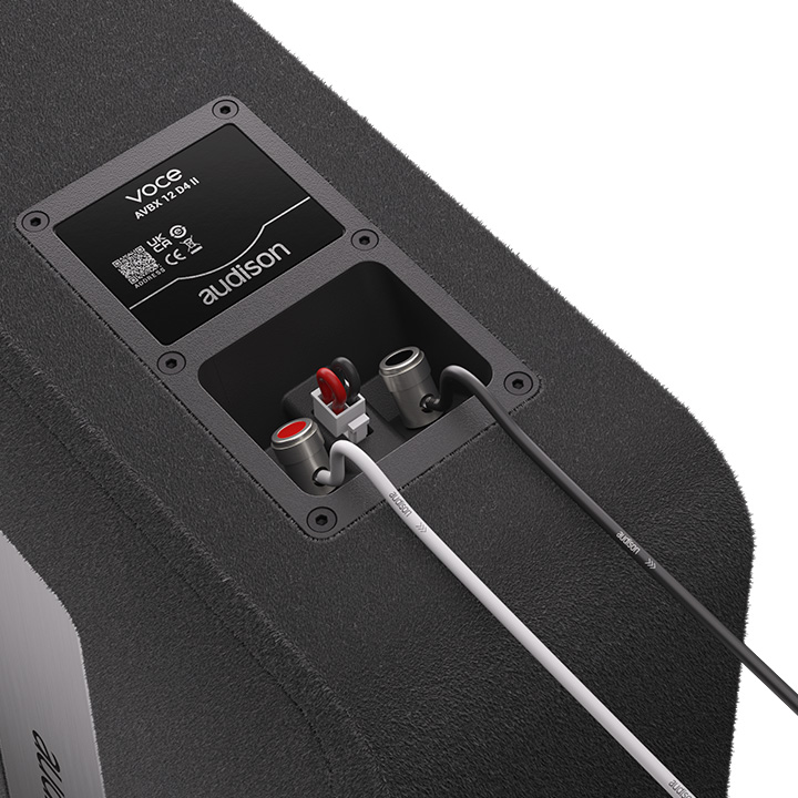 Le contrôle thermique est primordial pour les subwoofers de grande puissance. Les subwoofers VOCE II sont équipés du système de refroidissement Airflow Venting Cooling, AVC, un système de ventilation exclusif qui canalise l'air dans les cavités internes afin de refroidir la bobine mobile et d'empêcher la compression thermique. Cela garantit des performances stables, même à des niveaux SPL élevés et prolongés. Pour simplifier l'intégration, l'AV 10 II et l'AV 12 II sont équipés de bornes latérales à ressort, d'un câble de 8 AWG et de deux crochets d'acheminement des câbles intégrés, une solution propre et professionnelle pour les installations dans des boîtiers compacts ou des espaces difficiles.